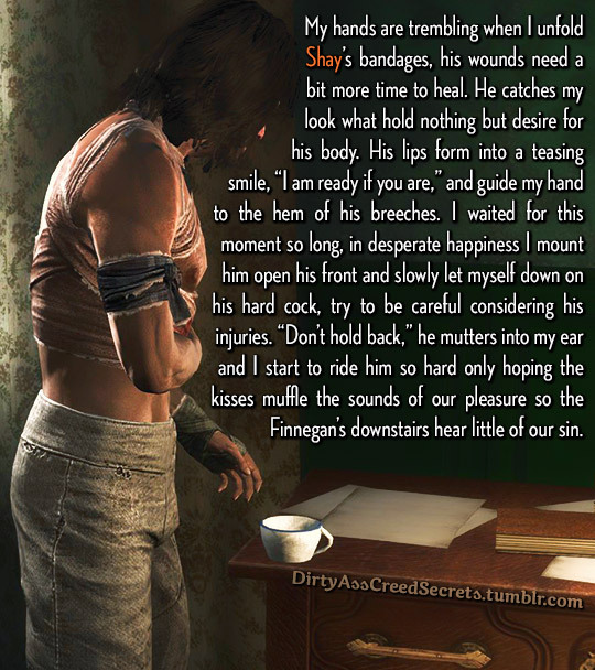 ‘My hands are trembling when I unfold Shay’s bandages, his wounds need a bit more time to heal. He catches my look what hold nothing but desire for his body. His lips form into a teasing smile, “I am ready if you are,” and guide my hand to the hem of his breeches. I waited for this moment so long, in desperate happiness I mount him open his front and slowly let myself down on his hard cock, try to be careful considering his injuries. “Don’t hold back,” he mutters into my ear and I start to ride him so hard only hoping the kisses muffle the sounds of our pleasure so the Finnegan’s downstairs hear little of our sin.’