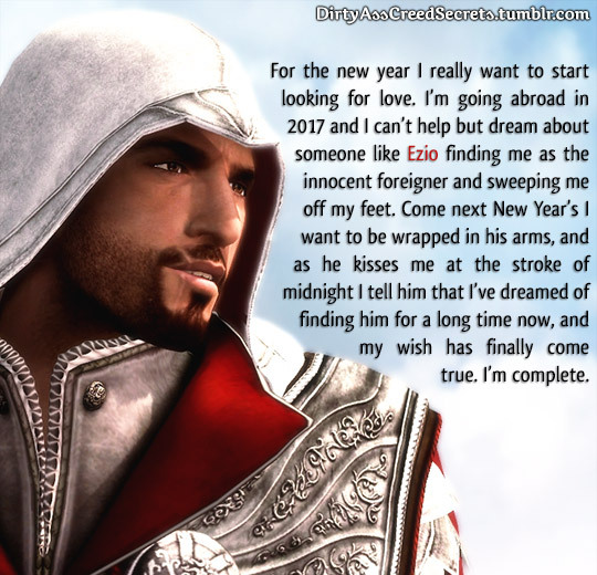 ‘For the new year I really want to start looking for love. I’m going abroad in 2017 and I can’t help but dream about someone like Ezio finding me as the innocent foreigner and sweeping me off my feet. Come next New Year’s I want to be wrapped in his arms, and as he kisses me at the stroke of midnight I tell him that I’ve dreamed of finding him for a long time now, and my wish has finally come true. I’m complete.’